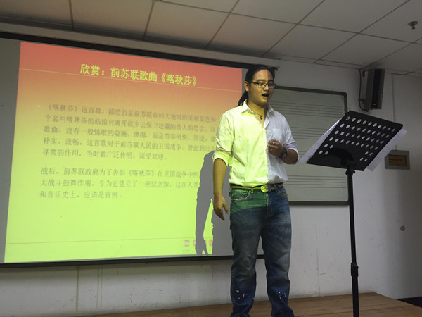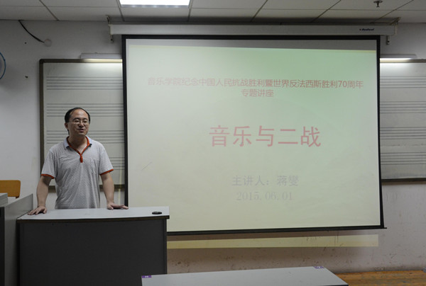 6月1日晚7时,音乐学院在音舞楼506教室成功举办“纪念中国人民抗日战争胜利暨世界反法西斯战争胜利70周年”专题讲座——《音乐与二战》,讲座由我院音乐学系副教授、民族音乐学博士蒋燮主讲。bw必威西汉姆联团委书记谢斌、音乐学院党总支书记张梅、党总支副书记曾娇琳以及全体辅导员、分团委学生会成员、各班班团干和入党积极分子一同聆听了讲座。