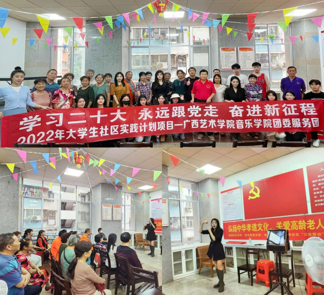 宣讲入社区:王慧美同学是今年发展的一名新党员,她入党前一直以严格的标准要求自己,积极向组织靠拢。光荣加入中国共产党之后,更是将自己的专业热情散播在需要的地方。今年11月初,她组织20多名学生干部走到青秀区南湖小区开展学习宣传党的二十大精神活动。她说:“能在党的二十大召开之年加入伟大的中国共产党是光荣而自豪的,我要认真履行党员义务,在本次活动中发挥自己的专业优势为社区老年音乐爱好者开展红歌合唱培训,践行爱老助老的社会责任和志愿服务精神。”