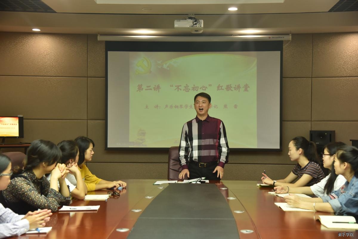 音乐学院青年声乐教师、声乐钢琴学生党支部书记熊雷老师在“不忘初心”红歌讲堂中,从自身的成长、学习经历讲起,激励同学们端正学习态度、处事态度,善于学习、抓住机会,学习红歌中的老一辈革命精神,牢记自己的责任与使命,勇于面对学习、成长过程中的困难。