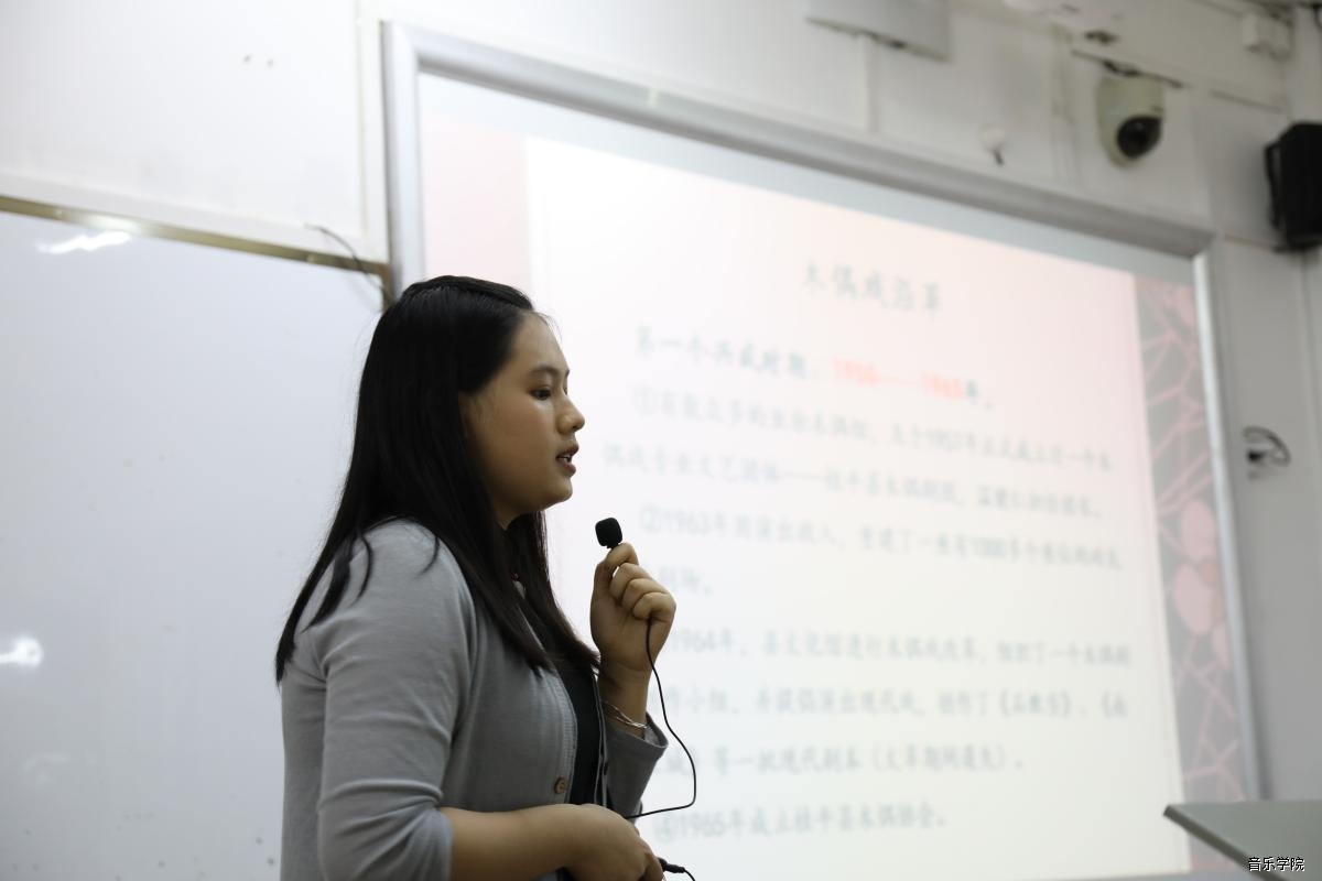10日晚是16、18级音乐学班进行的联合汇报《共赏八桂 世济其美》。首先是16级音乐学班带来的关于桂平杖头木偶戏的汇报陈述。汇报中,主讲人陈秋圆以桂平杖头木偶戏的简介、深析、生存现状三方面进行讲述,带领观众从历史沿革出发,对杖头木偶戏的类别、艺人信仰、题材、表演与唱腔及与人生活之联系进行了深刻的了解,并带来了同学们在当地习唱的一段木偶戏唱腔。在生存现状方面,16音乐学班同学在班主任的带领下,对杖头木偶戏传承人进行深度采访,得知该剧种目前存活之艰辛以及感受到传承人对剧种始终坚守、永不言弃的恒心。16音乐学班同学的精彩演述,除了给在场观众带来这一文化底蕴深厚的传统剧种前世今生的种种精彩以外,更传递出传承人心中永不熄灭的熊熊“传承”之火,薪火相传,生生不息,无论是杖头木偶戏亦或是其他,秉承这种信念,定能带来星星火种,然后渐趋燎原。