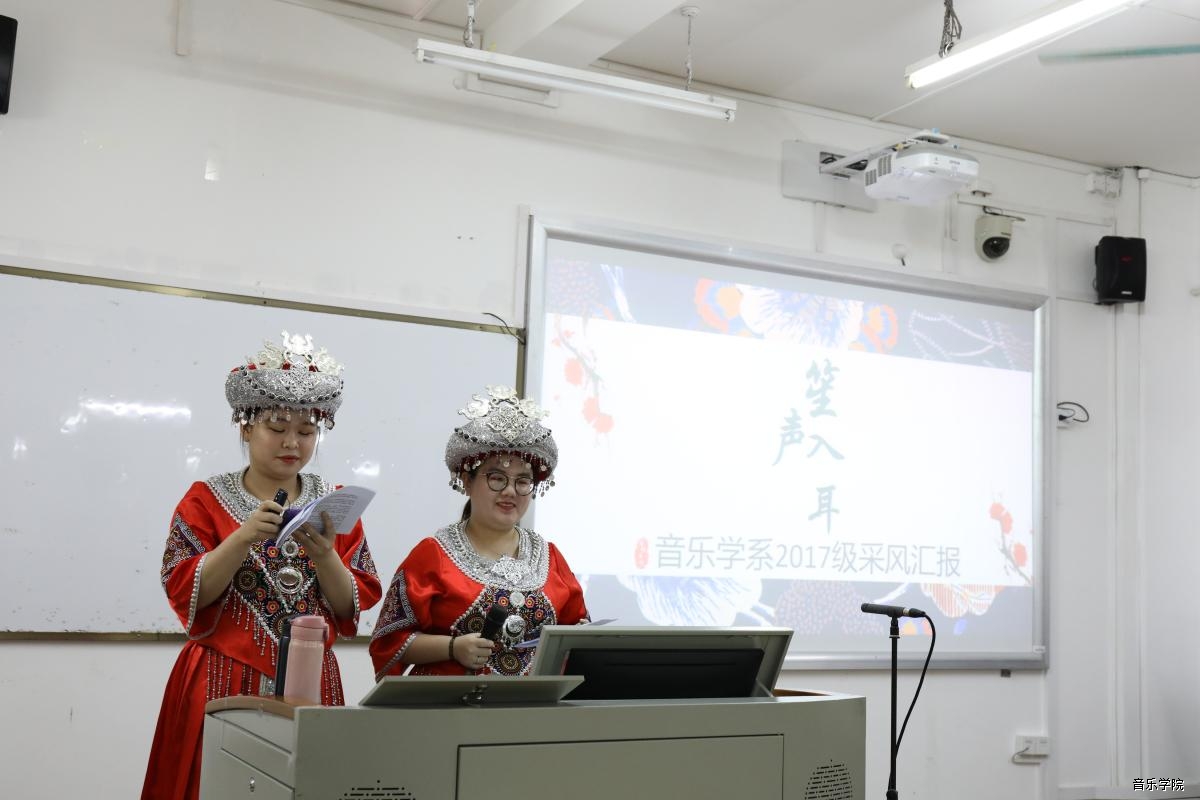 2019年6月10、13日晚,音乐学院2016、2017、2018级音乐学班春季学期田野采风汇报会于公共楼303教室顺利举行,现场氛围热烈、学术气息浓厚,体现了音乐学系一贯秉承的秉承理论与田野相结合的教学理念。各年级同学的汇报精彩纷呈,展现处音乐学专业学子意气风发、积极向上的精神面貌。莅临现场指导的领导、老师有:音乐学本科特色专业负责人、音乐教育学院院长吴霜教授、音乐学本科专业负责人、教务处副处长潘林紫教授、音乐学系主任蒋燮博士、音乐学系副主任李莉教授、杨柳成副教授、16音乐学班主任李常新老师、17音乐学班主任于涛博士、18音乐学班主任凌晨博士、苗族芦笙艺术家贾征老师等。