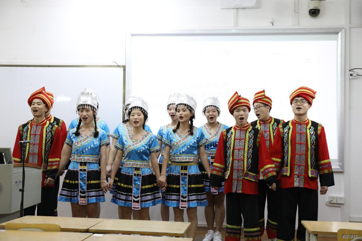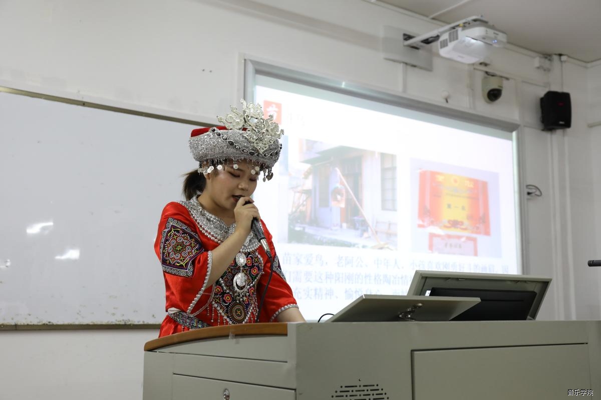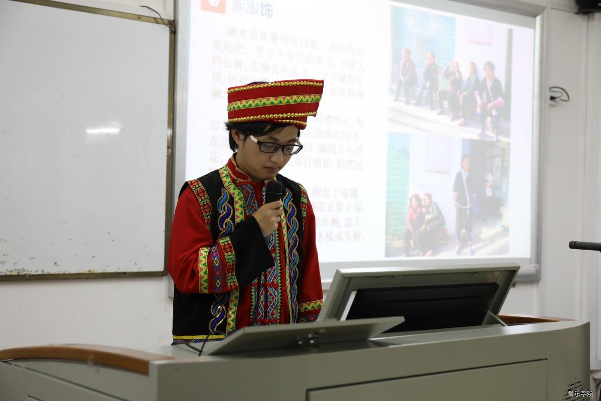13日晚是17音乐学班在融水雨卜苗寨和苗族文化保护示范基地的汇报,结合PPT,苏华茵、郭思燚、王若琪、韦相如、高明鑫等五位讲解人对融水的民俗文化建筑、服饰以及精彩逗趣的斗马、斗鸟习俗和苗族乐器芦笙、果哈、苗笛进行了深入、有趣的讲述,17级同学们还集体带来了一首用苗族音调编写的汉语民歌《油茶飘香心相连》。17音乐学班同学们的展示,不仅理论内涵丰富,演述过程中还加入了不少有趣的苗家习俗体验活动,声、乐、舞的和鸣仿佛引领人们踏入芳菲三月、笙歌阵阵的雨卜苗寨,让在场观众深切体会到山山水水情难忘、盛世笙歌如潮涌的苗乡盛景。