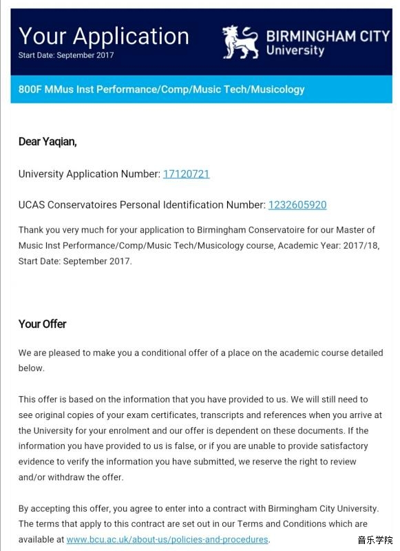近日,我院2013级音乐表演专业(钢琴演奏方向)本科生陆雅倩同学收到了英国著名音乐院校——伯明翰音乐学院钢琴演奏方向硕士研究生的录取通知书,成为我院第三位成功考取世界级音乐名校的学生,为学院和学校赢得了荣誉。更值得一提的是,伯明翰音乐学院一直秉承着“宁缺毋滥”的严格评审原则,2017年度面向中国仅招入了三名钢琴表演的硕士生研究生,可谓压力重重,竞争激烈!陆雅倩同学能够脱颖而出顺利考取,不仅是对其努力付出的一种极高肯定,同时也充分体现出了我校科学的教学管理方法以及专业教师先进的教学理念、出色的教学水平和严谨的治学态度。
