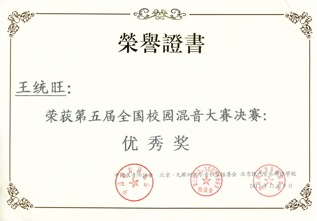 (音乐学院王统旺同学获奖证书)