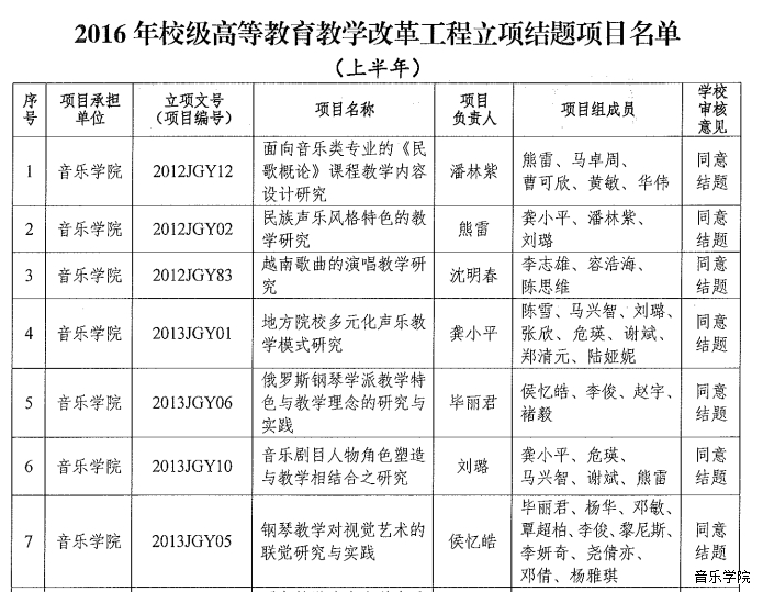 经各项目组申报,专家评审,由音乐学院承担的“面向音乐类专业的《民歌概论》课程教学内容设计研究”等7项校级高等教育教学改革工程立项项目获结题,具体名单如下: