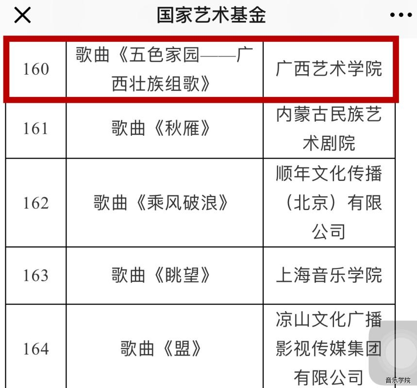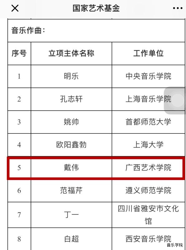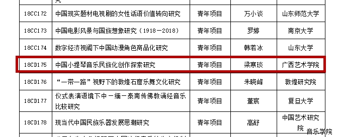2018年,音乐学院教师积极申报多个国家级项目,最终喜获三项立项。其中,管弦系副主任梁寒琰老师申报的《中国小提琴音乐民族化创作探索研究》获2018年度国家社科基金艺术学青年项目立项,民艺系戴伟副教授申报的2019年度国家艺术基金青年艺术创作人才资助项目及小型剧(节)目和作品项目歌曲《五色家园——广西壮族组歌》2个项目也均获立项。