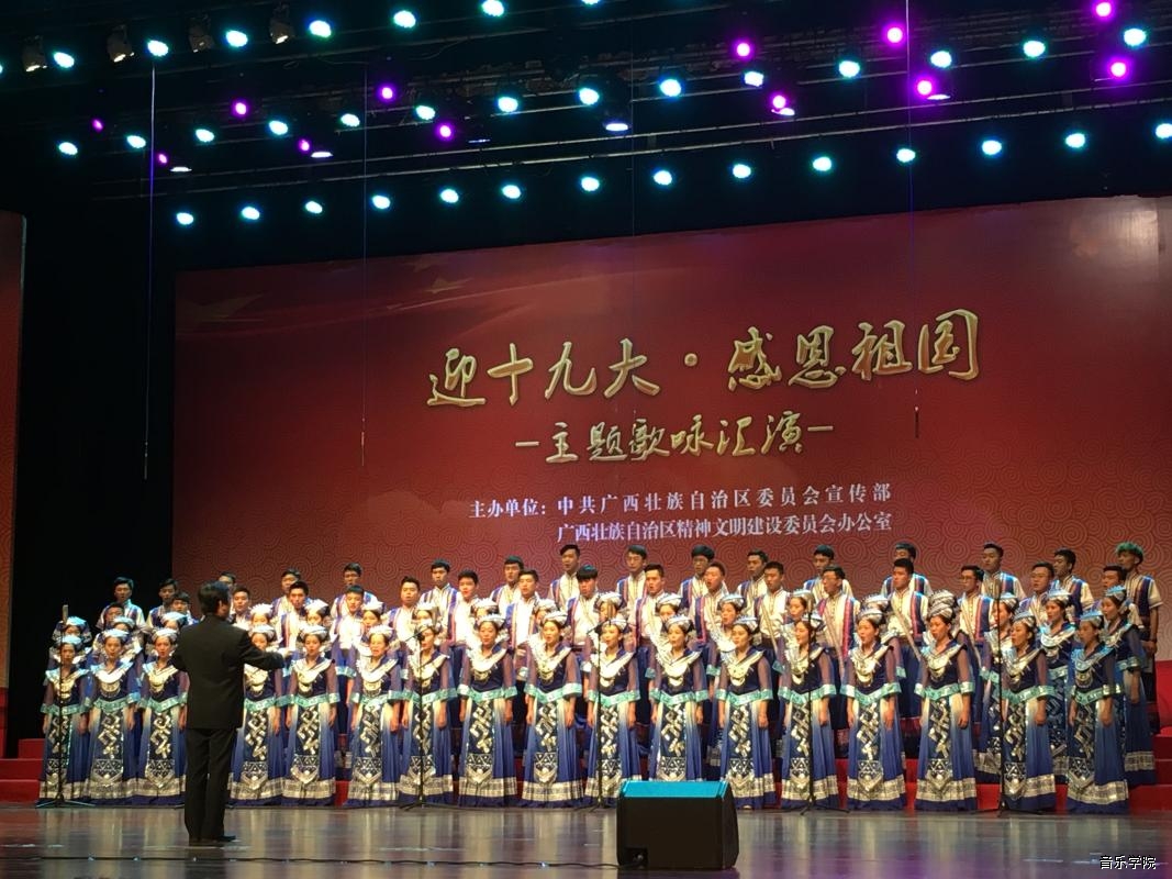 2017年9月24日,由中共广西壮族自治区委员会宣传部、广西壮族自治区精神文明建设委员办公室主办的“迎十九大·感恩祖国”主题歌咏汇演活动在南宁人民会堂举行。此次活动共有来自全区各地各部门的21支合唱队参加,并由广西音乐家协会黄朝瑞主席、傅滔副主席等7位广西著名音乐家组成的专业评委以及24位各界人士组成的大众评委严格评选、打分。