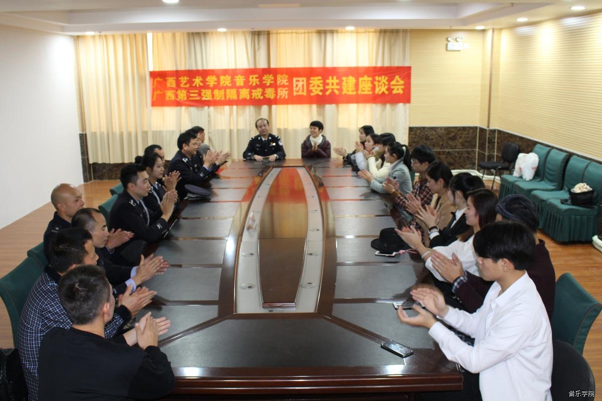 演出结束后,广西第三强制隔离戒毒所团委与我院团委共建座谈会在综合楼三楼会议室举行。戒毒所党委副书记、政委王新,党委委员、政治处主任廖昶,政治处副主任农鹏飞,团委书记李先东,团委副书记黄任明及部分团员代表,音乐学院团委书记赵艳飞、辅导员林慧思及部分学生团员代表参加了座谈。座谈会上,所党委副书记、政委王新对我院一行表示了热烈的欢迎,并感谢我院对所工作长期的关心与支持。他说到,双方团委此次开展结对共建活动十分有意义,希望双方团委能以结对共建为契机,开展好结对共建活动,优势互补,共同发展,以实际行动延续两个单位结对共建友好关系,为双方单位的事业发展作出积极的贡献。