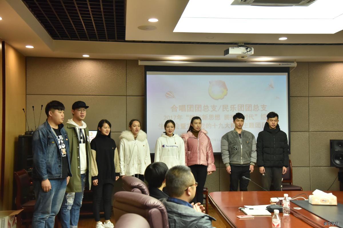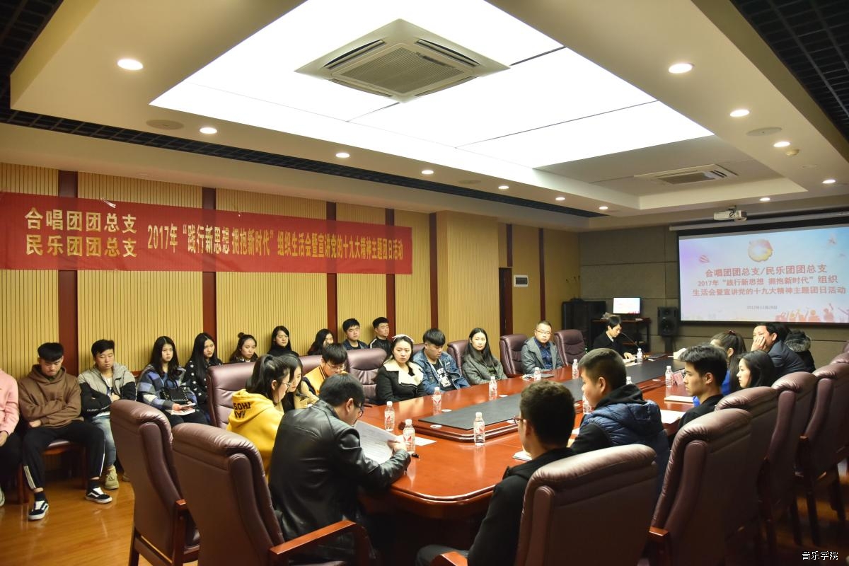 为组织广大团员深入学习习近平新时代中国特色社会主义思想和党的十九大精神,落实学懂弄通做实的重要要求,根据学校《关于开展以“践行新思想 拥抱新时代”为主题的团组织生活会暨宣讲党的十九精神主题团日活动的通知》(广艺党团【2014】34号)的文件精神,音乐学院团委于2017年12月28日组织合唱团团总支和民乐团团总支在音乐学院会议室开展了“践行新思想 拥抱新时代”组织生活会暨宣讲党的十九大精神主题团日活动。学校团委书记谢斌、学校团委社团管理部部长郑靖,音乐学院党委副书记、纪委书记李静出席了活动,活动由音乐学院团委书记赵艳飞主持。