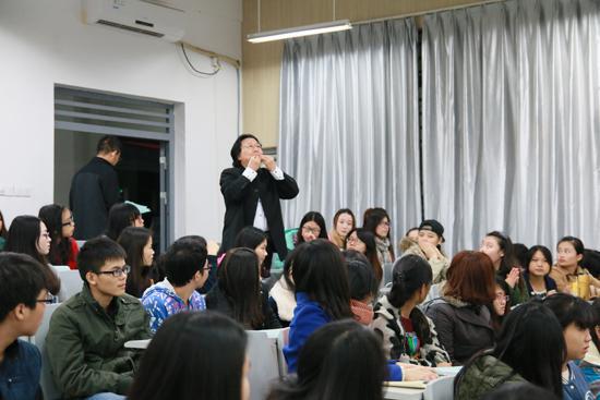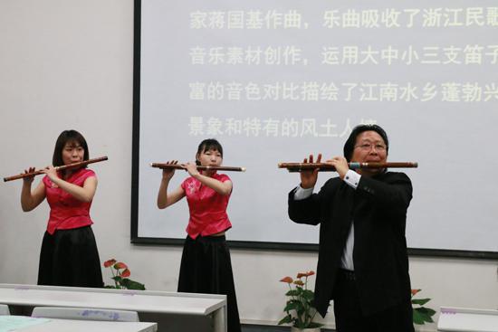李海生教授以一首广西壮族山歌《多谢了》作为讲座的开场,对前来聆听讲座的师生表示感谢。讲座围绕怎样提高音乐艺术欣赏能力、如何欣赏民族管乐器两个问题展开,将音乐与表演结合,让大家真正感受中国乐器的精彩与魅力。李海生教授强调,欣赏一部音乐作品,应全面的了解作者、作品时代背景、民族特征等各方面的知识。随后,李海生教授生动形象的阐述了管乐器成声原理,并针对不同作曲家的作品、不同的曲目风格,与自己的本科生和研究生通过民族管乐器曲笛、挷笛、排笛等管乐器进行现场的演奏与讲解,为在场师生献上了一场传统而又独具魅力的音乐盛宴。同时,李海生教授还着重介绍了自己获得国家专利的乐器“脸谱十孔埙”,并深情的演奏了一首《楚歌》,将现场气氛推向高潮。本次讲座让在场师生感受了中国民族音乐的魅力,了解了民族管乐器,增强了艺术鉴赏能力,为当代大学生全面发展奠定了良好的基础。