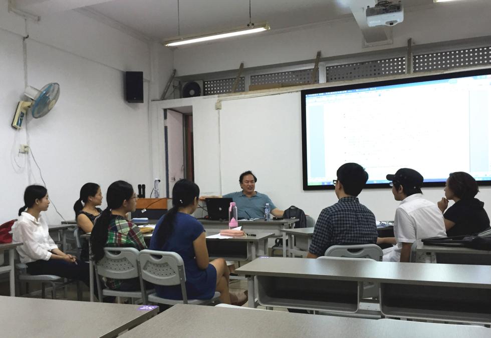 当天下午,陆培教授还在音舞楼对音乐学院作曲系青年教师进行了一次专业技能培训,培训以学术讲座的形式进行,题为《有关管弦乐的创作》,作曲系全体青年教师到场聆听。陆培教授采用视听结合的形式,给大家介绍了关于他自己的一些有关管弦乐创作的思路与经验,如:在作品发展时如何制造紧张感吸引听众,如何解决给予满足感等等。陆培教授还以作品《山.海.经》、《琢玉》为例,讲述了自己在实际创作中实现民族音乐与现代写作技法相融合的经验和体会。教师们在对照乐谱聆听了陆培教授的作品后踊跃发言提问,互相交流创作经验,现场学术氛围十分浓厚且热烈。