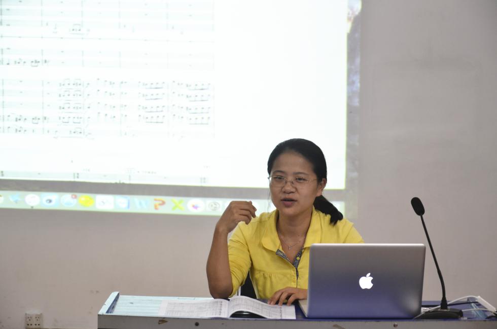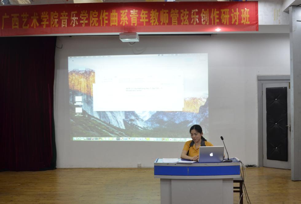 研讨分两部分进行,首先是青年教师管弦乐作品展示与研讨。作曲系青年教师纷纷就自己不同形式、风格各异的管弦乐队作品进行了展示与说明,并与参加研讨的其他学员们进行积极的讨论。陆培教授也对大家的作品一一进行点评并提出修改建议,他表示:大家的音乐作品都表现出了精巧的构思和丰富的创造力,有着很大的发展潜力,大家都应对广西的音乐教育事业多多做贡献。