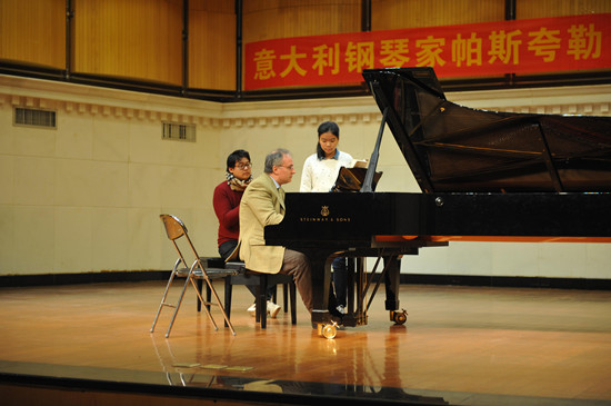 帕斯夸勒·亚诺毕业于英国皇家音乐学院,曾获多项重要钢琴大赛奖,与诸多交响乐团合作,并培养出国际和国内比赛中获奖的众多学生。此次讲学主要面向音乐学院钢琴系师生,以一对一上课的形式进行,由同学们上台演奏曲目,弹奏结束后,帕斯夸勒.亚诺教授亲自点评,指出该同学弹奏曲目的不足之处,并对其现场示范。同时,帕斯夸勒.亚诺教授还就曲目的感情色彩、踩踏板的巧妙运用、手指如何灵活驾驭曲目等问题作了详细讲解。