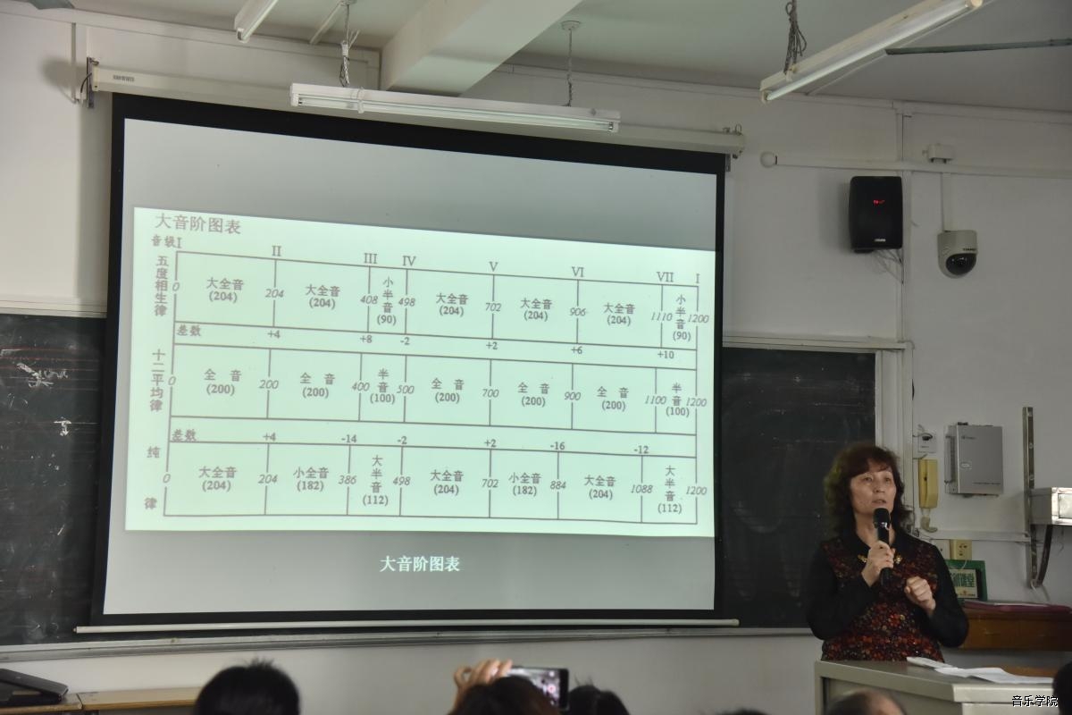 本次讲座,白翎教授从音乐起源之泛音、如何记忆泛音列、三种律制的大音阶图表和曲例详细讲解了如何运用三种律制解决视唱练耳教学中的音准问题。从国内外现状、视唱练耳教学的目的、课程的设置、教程的建设、具体的教学环节多方面和谱例阐述了和声理论在视唱教学与听觉训练中的重要意义。针对学生在五声调性视唱中容易出现跑调、串调等现象,她本人提出“偏音不偏,以偏辅正”教学理念,论述传统五正声与偏音之间的辩证关系,运用“偏音加音换音音阶训练法”,掌握视唱中不同的调式偏音,帮助学生建立中国民族五声性的调式思维,感受偏音在音乐中丰富的调式调性色彩与风格,使学生受益匪浅。讲座结束后,白翎教授还对教师在教学中遇到的问题给予了详细地解答,对提高教师的视唱练耳教学水平,保证教学质量起到了很好的帮助作用。