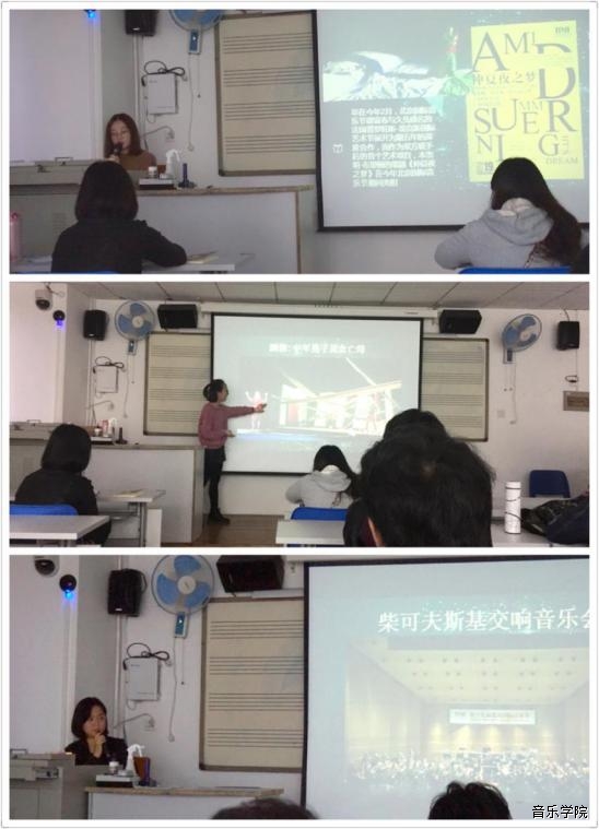 最后一部分是由曾令阳同学介绍的四场高水平、令人印象深刻的音乐会。首先,介绍了吴蛮的“琵琶行”公益音乐会,对该场音乐会大部分作品的内容、表现形式以及创新性做了详细的介绍并汇报了自我感想;其次,曾令阳同学向大家讲述了谭盾携手广州交响乐团的音乐会,和该场音乐会带来的启发,以及谭盾先生在音乐创作中对将中国文化推向世界所起到的贡献;随后,曾令阳同学向大家介绍了世界顶尖交响乐团——柴可夫斯基交响乐团的柴可夫斯基全套交响音乐会,以及指挥家的音乐会导讲和其中的启发;最后她向大家简单介绍了俄罗斯图列茨基合唱团的音乐会情况。