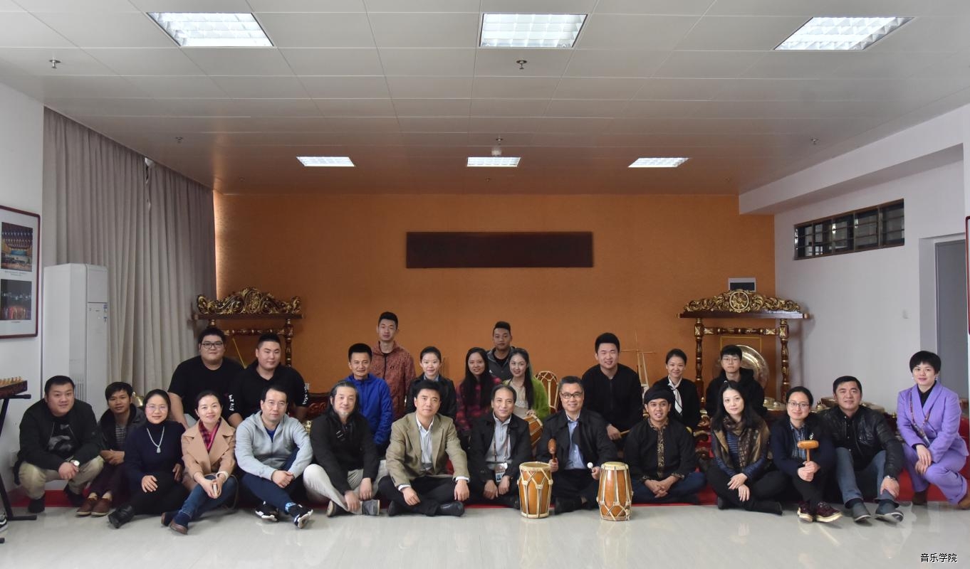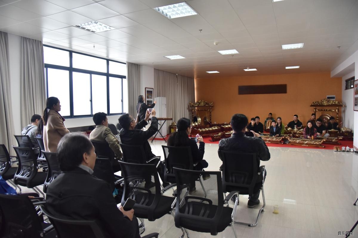 交流结束后,周建明院长一行在我院领导的陪同下,参观了音乐学院文化建设区域、“乐读”书吧、学校音乐厅等场地。随后在艺术研究院民研所专业教师楚卓副教授的引导下,前往民间艺术实践工作坊观看由民研所研究生及我院民乐系学生组成的印尼甘美兰演奏乐队的表演,并参观民族民间艺术藏品展馆。