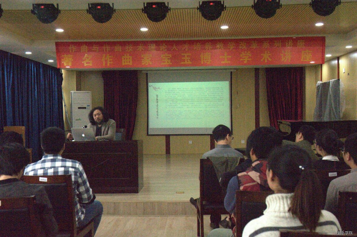 2017年12月1日,由音乐学院主办、音乐学院作曲系承办的“著名作曲家宝玉博士学术讲座”在学校音舞楼506教室成功举行。本次讲座共两场,是“作曲与作曲理论人才培养模式改革”系列讲座之一。