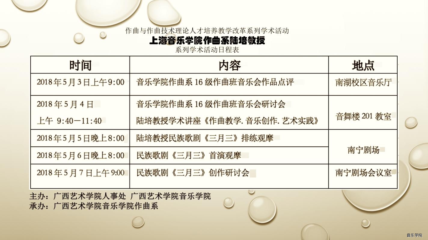 5月5日、6日两晚,作曲系师生全程观摩了国家艺术基金2017年度资助项目民族歌剧《三月三》的排练与首演,现场体验了这部极具广西民族民间音乐特色,将山歌文化与西方歌剧艺术形式相结合的歌剧作品。。该剧由陆培教授作曲并编剧,梁绍武编剧,冯佳担任总导演,讲述了在广西三月三歌圩文化背景下发生的感人故事,表现了人物性格爱恨交织的情景,在编剧、音乐创作、舞美、服装、灯光、音响等方面都获得很大的成功。