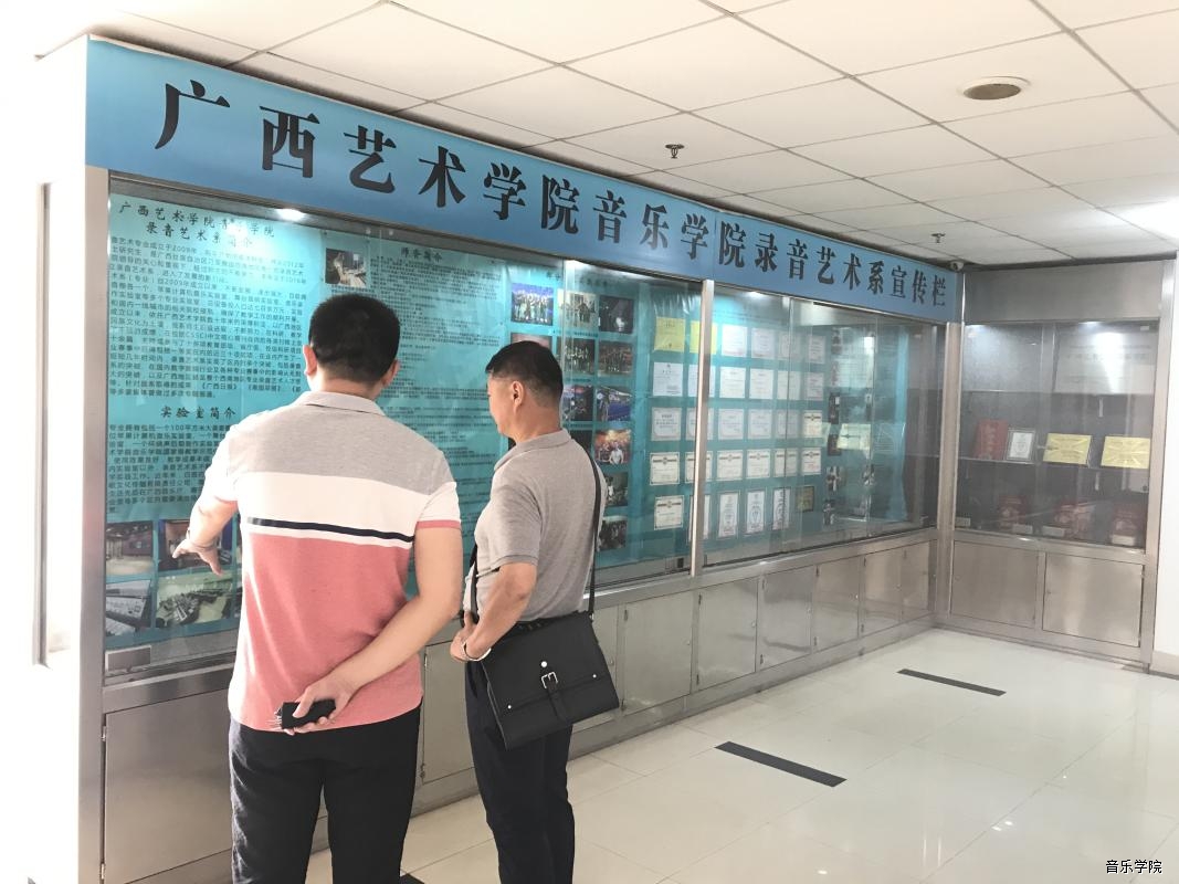 王智教授在华伟老师陪同下参观录音艺术系宣传栏