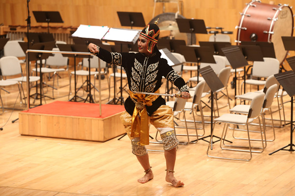 音乐会伊始,来自泰国布拉帕大学的学生首先为观众们表演了具有泰国民族风情的音乐舞蹈《将军出征舞》。此曲源自泰国王朝古老的祈福仪式,根据暹罗皇家的传统,将军在上战场之前要将五花水洗净身体穿上盔甲,然后在传统的宫廷音乐陪衬下进行出征祈福仪式,祈愿战队百战百胜、平安归来。接着,中国东盟青年管弦乐团团长钟峻程、副团长余家和,作曲家Chaipruck Mekara(泰国)、Michael Asmara(印度尼西亚)、陈丹布、曾海平以及Michael Edwad Edgerton(美国)上台分别致辞。