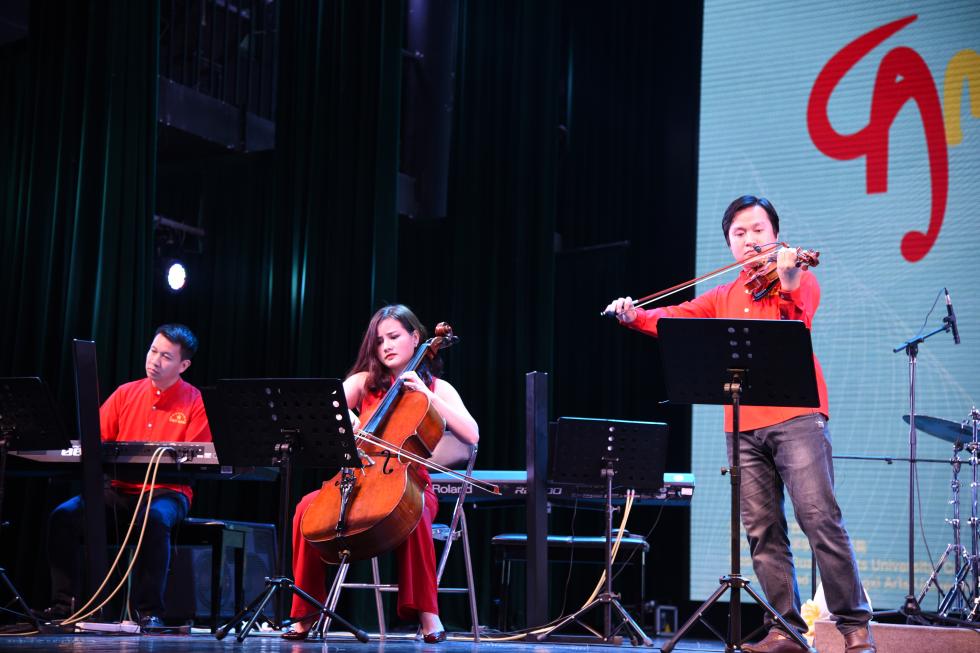 音乐会上,红叶乐团的演奏家们为大家演奏了由越南军队文化艺术大学及bw必威西汉姆联附属中等艺术学校青年教师共同创作的《越南的问候》、《即兴腰鼓演奏》等不同表演风格的十首爵士乐作品,激情四射的精湛表演博得了阵阵热烈的掌声,让在场观众们充分感受到了爵士乐迷人的魅力。最后,音乐会在表达中越友好和平的《友谊之歌》中圆满落下帷幕。