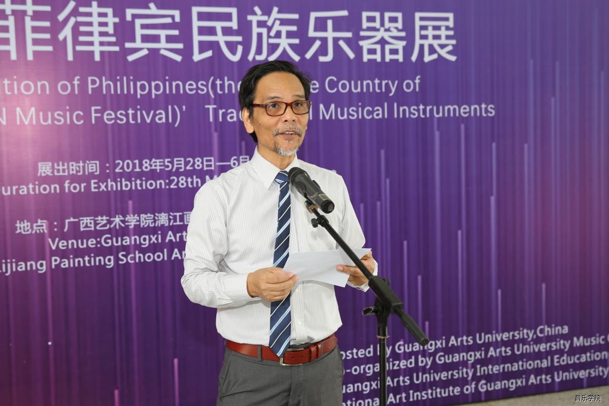 2018年5月30日上午9时,2018第七届中国—东盟音乐周主题国菲律宾民族乐器展开幕式在学校漓江画派大楼一楼如期举行。全国政协常委、中国音乐家协会主席、北京现代音乐节艺术总监叶小纲教授,菲律宾驻广州副总领事潘伟志,菲律宾大学音乐学院院长Veren de la pena,国际现代音乐协会(ISCM)主席Swinnen Peter Agnes A,我校党委书记蔡昌卓、副校长侯道辉,音乐学院院长蔡央、党委书记张梅,国际交流处处长赵克,中国-东盟音乐周艺术总监钟峻程等领导嘉宾及与会专家、学者出席开幕式。开幕式由蔡央院长主持。