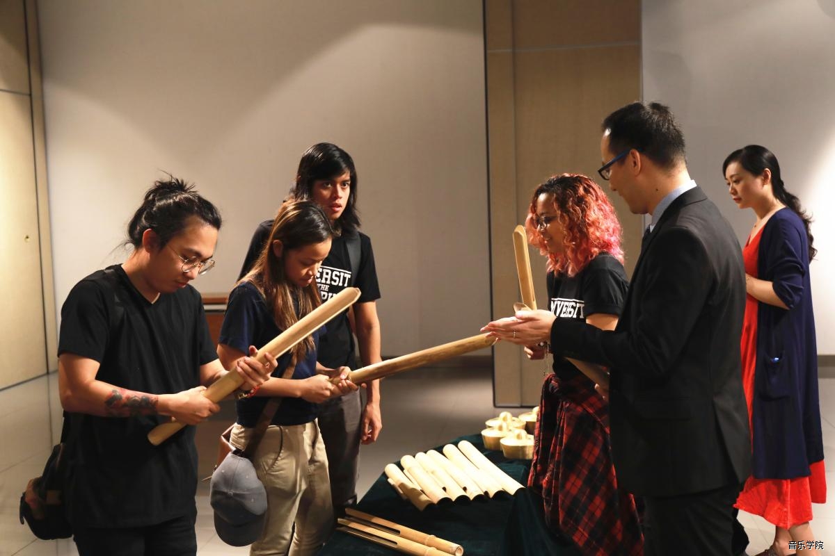 菲律宾大学音乐学院的同学现场演示菲律宾民族传统竹制乐器