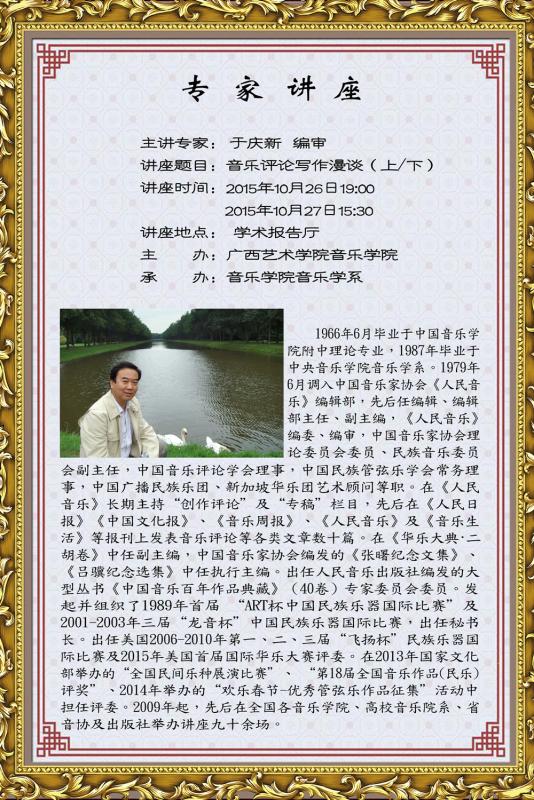 【2015年10月26、27日讲座】《人民音乐》编审于庆新讲座:《音乐评论写作漫谈》 来源: 作者: 更新时间:2015-10-15 08:31:58 浏览次数: 次 【字体:小 大】 分享到: 【打印正文】