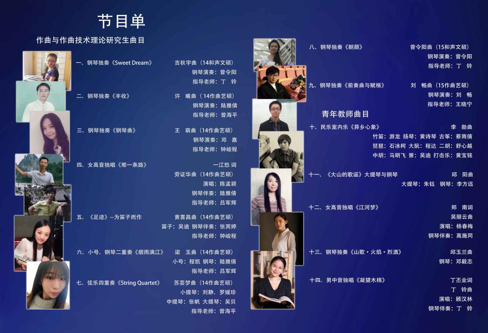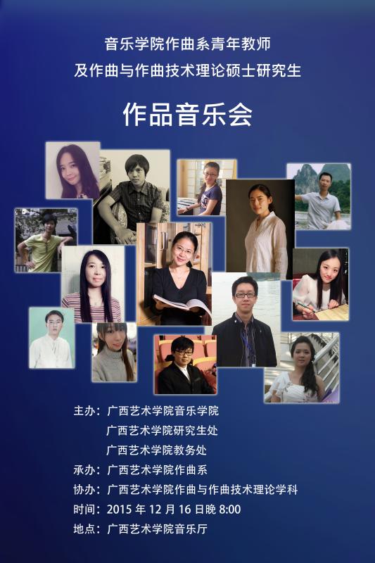 【2015年12月16日音乐会】音乐学院作曲系青年教师及作曲与作曲技术理论硕士研究生作品音乐会 来源: 作者: 更新时间:2015-12-08 17:33:53 浏览次数: 次 【字体:小 大】 分享到: 【打印正文】