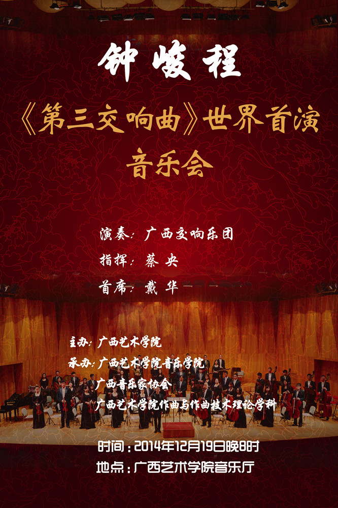 【2014年12月19日音乐会】音乐学院钟峻程教授《第三交响曲》世界首演音乐会 来源: 作者: 更新时间:2014-12-10 09:28:26 浏览次数: 次 【字体:小 大】 分享到: 【打印正文】