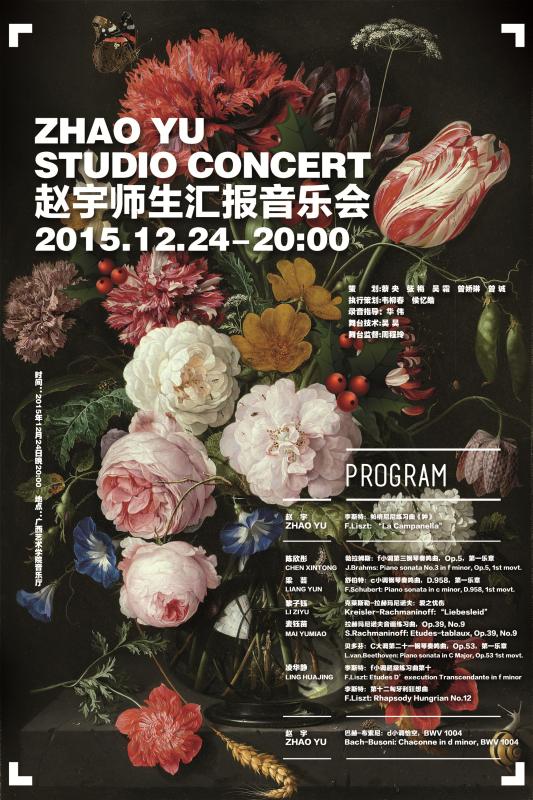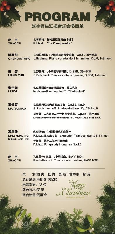 【2015年12月24日音乐会】音乐学院钢琴系赵宇师生汇报音乐会 来源: 作者: 更新时间:2015-12-21 19:00:38 浏览次数: 次 【字体:小 大】 地点:南湖校区音乐厅 分享到: 【打印正文】
