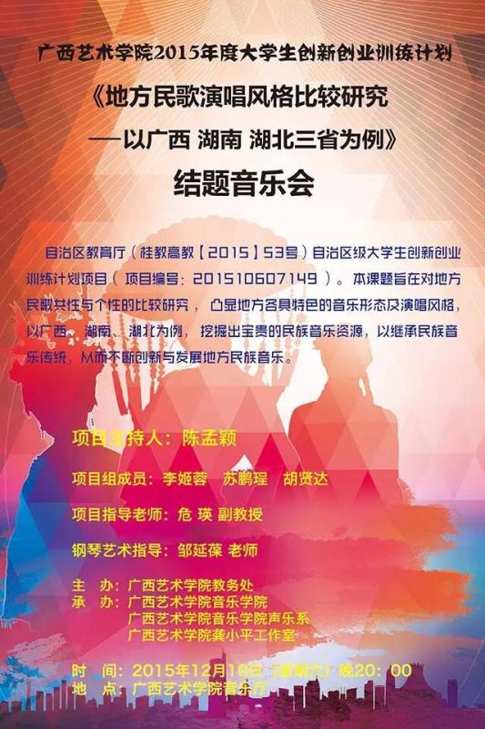 【2015年12月19日音乐会】《地方民歌演唱风格比较研究——以广西 湖南 湖北三省为例》结题音乐会 来源: 作者: 更新时间:2015-12-18 16:12:21 浏览次数: 次 【字体:小 大】 分享到: 【打印正文】