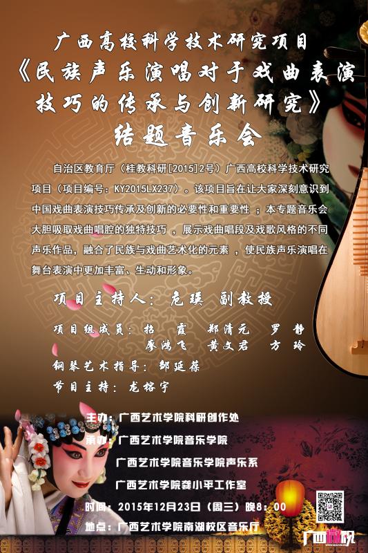 【2015年12月23日音乐会】《民族声乐演唱对于戏曲表演技巧的传承与创新研究》结题音乐会 来源: 作者: 更新时间:2015-12-20 20:12:52 浏览次数: 次 【字体:小 大】 分享到: 【打印正文】