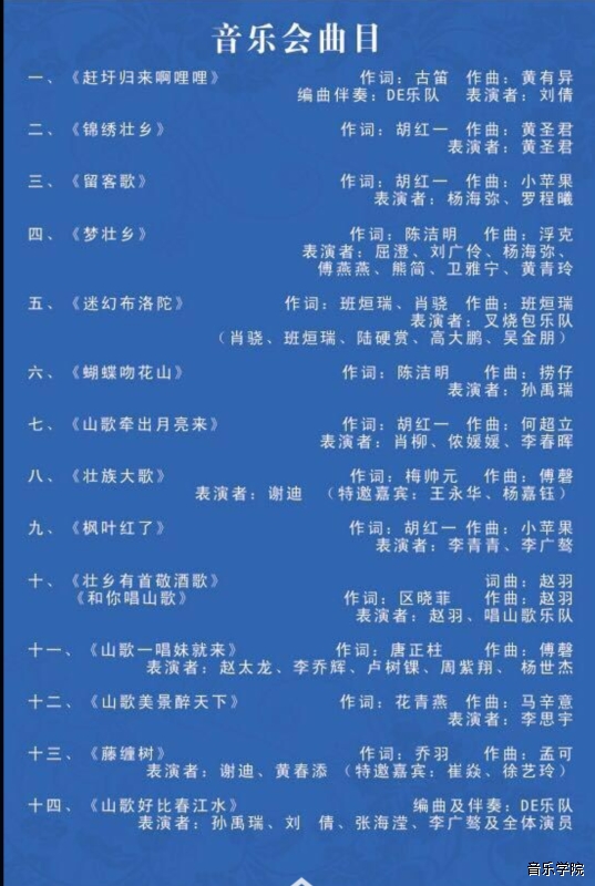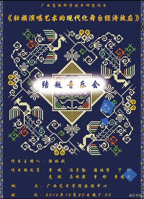 【2016年10月20日音乐会】广西高校科学技术研究项目《壮族演唱艺术的现代化舞台经济效应》结题音乐会 来源: 作者: 更新时间:2016-10-19 16:36:44 浏览次数: 次 【字体:小 大】 分享到: 【打印正文】