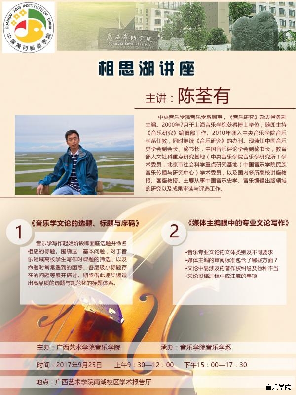 【2017年9月25日讲座】中央音乐学院音乐学系编审、《音乐研究》杂志常务副主编陈荃有学术讲座 来源: 作者: 更新时间:2017-09-17 17:38:07 浏览次数: 次 【字体:小 大】 分享到: 【打印正文】