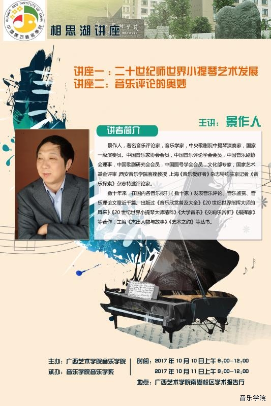 【2017年10月10、11日讲座】著名音乐评论家、音乐学家,中央歌剧院中提琴演奏家,国家一级演奏员景作人教授学术讲座 来源: 作者: 更新时间:2017-09-22 10:49:03 浏览次数: 次 【字体:小 大】 分享到: 【打印正文】