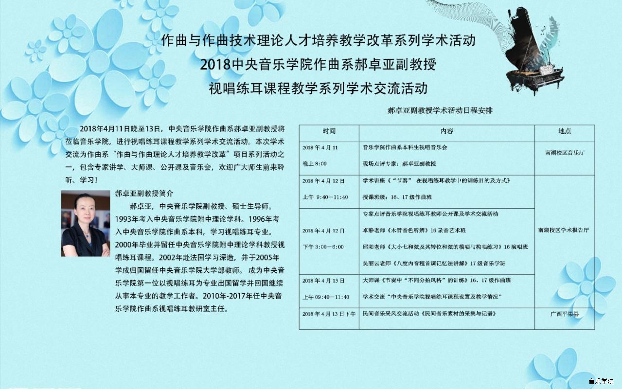 【2018年4月11-13日学术活动】中央音乐学院作曲系郝卓亚副教授视唱练耳课程教学系列学术交流活动 来源: 作者: 更新时间:2018-04-04 09:32:50 浏览次数: 次 【字体:小 大】 分享到: 【打印正文】