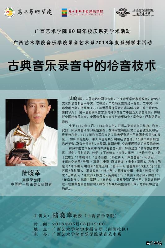 【2018年5月8日讲座】格莱美录音艺术奖唯一华人得主、高级录音师陆晓幸教授学术讲座 来源: 作者: 更新时间:2018-05-08 13:08:50 浏览次数: 次 【字体:小 大】 分享到: 【打印正文】