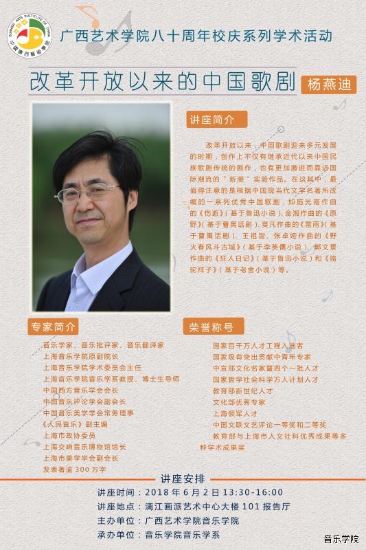 【2018年6月2日讲座】音乐学家、音乐批评家、音乐翻译家杨燕迪教授学术讲座《改革开放以来的中国歌剧》 来源: 作者: 更新时间:2018-05-30 09:34:13 浏览次数: 次 【字体:小 大】 分享到: 【打印正文】